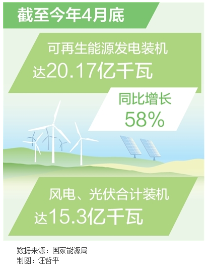 記者近日從國(guó)家能源局獲悉:截至今年4月底,我國(guó)可再生能源發(fā)電裝機(jī)已突破20億千瓦,達(dá)到20.17億千瓦,這約等于90個(gè)三峽電站的總裝機(jī),同比增長(zhǎng)58%。其中,風(fēng)電、光伏合計(jì)裝機(jī)達(dá)到15.3億千瓦,超過火電裝機(jī)。2024年,我國(guó)可再生能源新增裝機(jī)3.73億千瓦,已連續(xù)兩年突破3億千瓦,在全球新增裝機(jī)的占比超過50%。