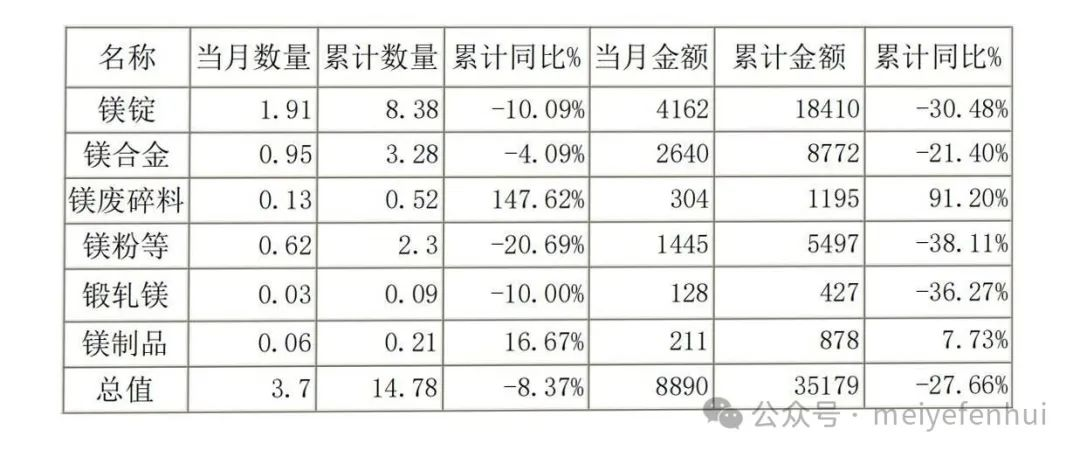 據(jù)海關(guān)總署統(tǒng)計數(shù)據(jù)顯示,2025年4月份中國出口各類鎂產(chǎn)品約3.7萬噸,環(huán)比下降10.84%,同比增長3.35%,出口金額約0.89億美元,環(huán)比下降9.2%,同比下降12.75%。