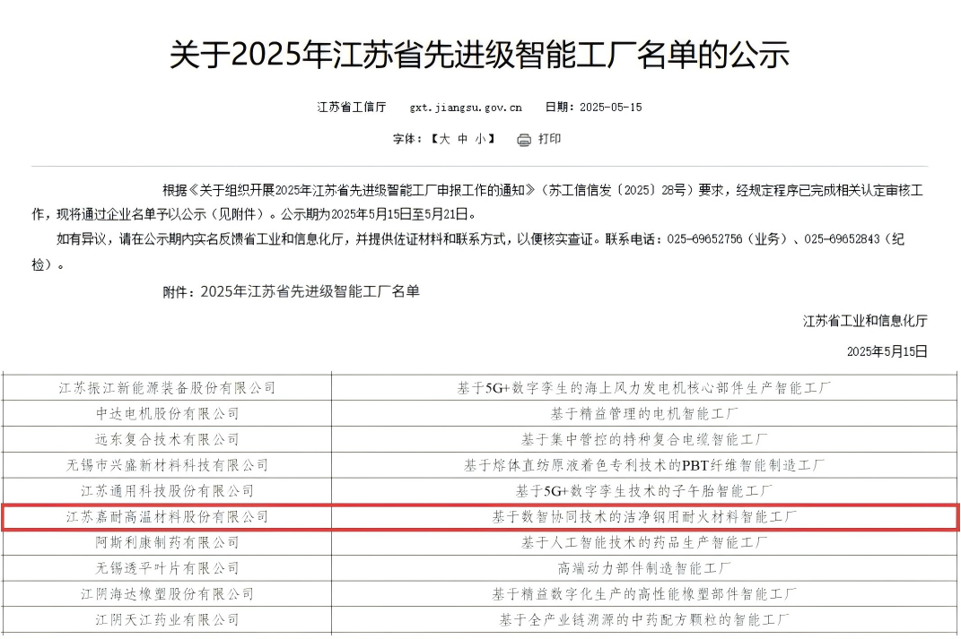近日,江蘇省工業(yè)和信息化廳公布2025年先進(jìn)級智能工廠名單,江蘇嘉耐高溫材料股份有限公司依托“基于數(shù)智協(xié)同技術(shù)的潔凈鋼用耐火材料智能工廠”成功入選“江蘇省先進(jìn)級智能工廠”名單↓