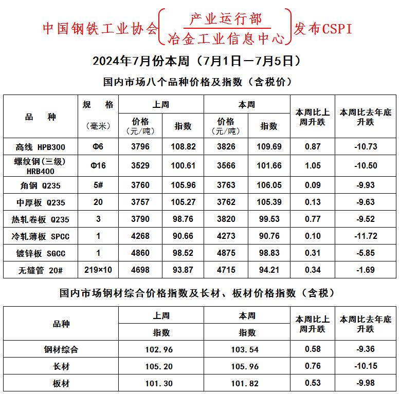 2024年7月份本周(7月1日-7月5日)國內(nèi)市場八個品種價格及指數(shù)