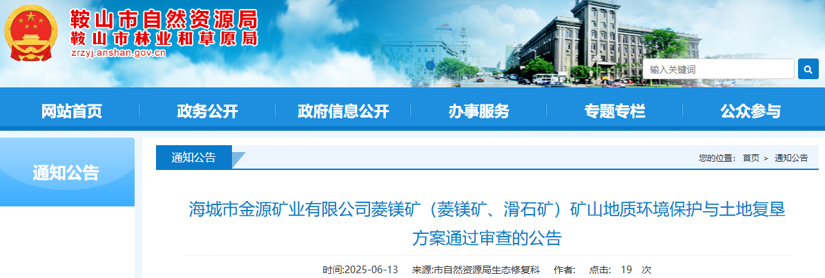根據(jù)《土地復(fù)墾條例》、《土地復(fù)墾條例實施辦法》、《自然資源部關(guān)于規(guī)范臨時用地管理的通知》(自然資規(guī)〔2021〕2號)、《關(guān)于加強土地復(fù)墾工作的通知》(遼自然資發(fā)〔2021〕3號)和《關(guān)于加強土地復(fù)墾方案編制及評審工作的通知》(遼國土資發(fā)〔2008〕22號)等文件的有關(guān)規(guī)定和要求,海城市金源礦業(yè)有限公司菱鎂礦(菱鎂礦、滑石礦)礦山地質(zhì)環(huán)境保護與土地復(fù)墾方案通過審查,現(xiàn)予公告。