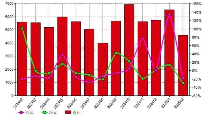 2025年2月份美國(guó)石墨粉進(jìn)口量4,589.76公噸,去年同期為5,593.07公噸,上月為6,525.39公噸,同比下滑17.94%,環(huán)比下滑29.66%。