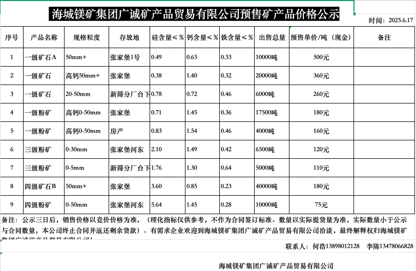 海城鎂礦集團(tuán)廣誠礦產(chǎn)品貿(mào)易有限公司預(yù)售礦產(chǎn)品價格公示