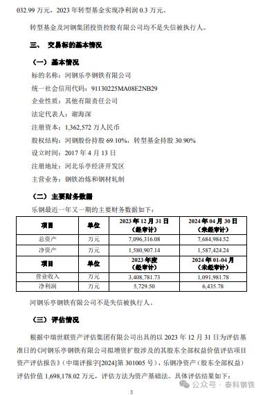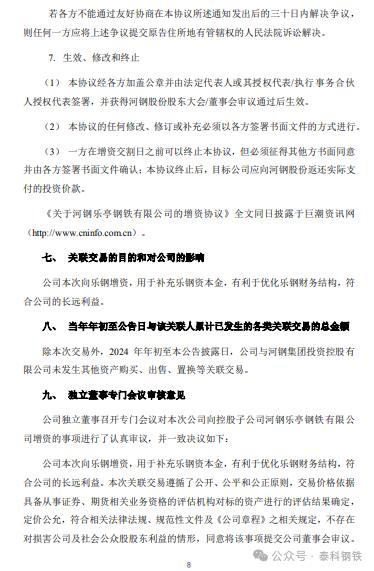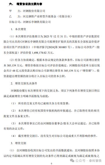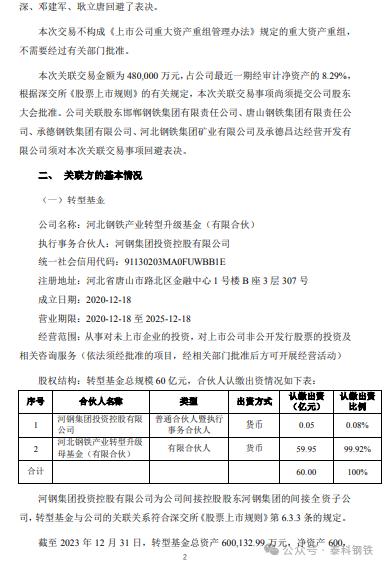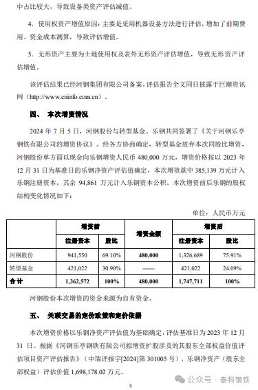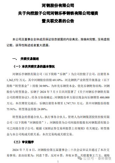 7月9日,河鋼股份發(fā)布公告,河鋼樂亭鋼鐵有限公司(以下簡稱“樂鋼”)為公司控股子公司,注冊資本1,362,572萬元,其中河鋼股份持股69.10%,河北鋼鐵產(chǎn)業(yè)轉(zhuǎn)型升級(jí)基金(以下簡稱“轉(zhuǎn)型基金”)持股30.90%。為補(bǔ)充樂鋼資本金,優(yōu)化樂鋼財(cái)務(wù)結(jié)構(gòu),河鋼股份與轉(zhuǎn)型基金、樂鋼于2024年7月5日共同簽署了《關(guān)于河鋼樂亭鋼鐵有限公司的增資協(xié)議》,經(jīng)各方協(xié)商確定,河鋼股份單方面以現(xiàn)金向樂鋼增資480,000萬元。本次增資完成后,樂鋼注冊資本增至1,747,711萬元,其中河鋼股份持股75.91%,轉(zhuǎn)型基金持股24.09%。