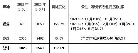 1.褐煤進口激增:2025年前5個月,褐煤進口量飆升至217.4萬噸,較2024年同期的84.5萬噸激增157%!其在總進口量中的占比從僅約2.7%躍升至約7.1%,增長勢頭遠超其他煤種。