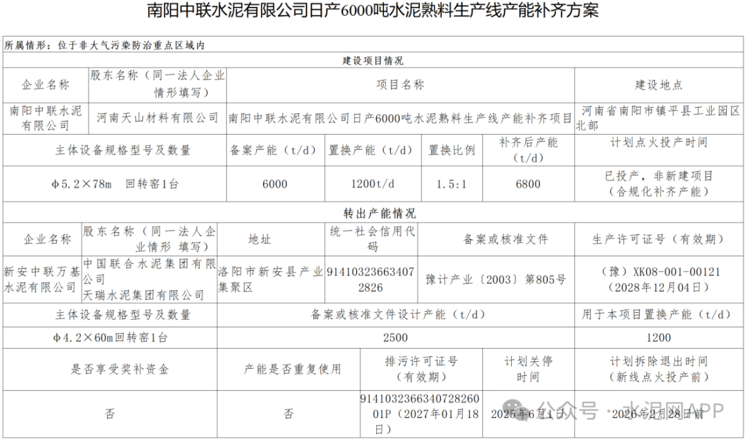 公示顯示,南陽中聯(lián)水泥有限公司日產(chǎn)6000噸水泥熟料生產(chǎn)線置換補充產(chǎn)能800t/d,補齊后產(chǎn)能6800t/d,置換比例1.5:1。退出產(chǎn)能來自新安中聯(lián)萬基水泥2500t/d生產(chǎn)線,用于本項目置換產(chǎn)能1200t/d,該生產(chǎn)線計劃2025年6月1日關(guān)停,2026年2月28日前拆除退出。