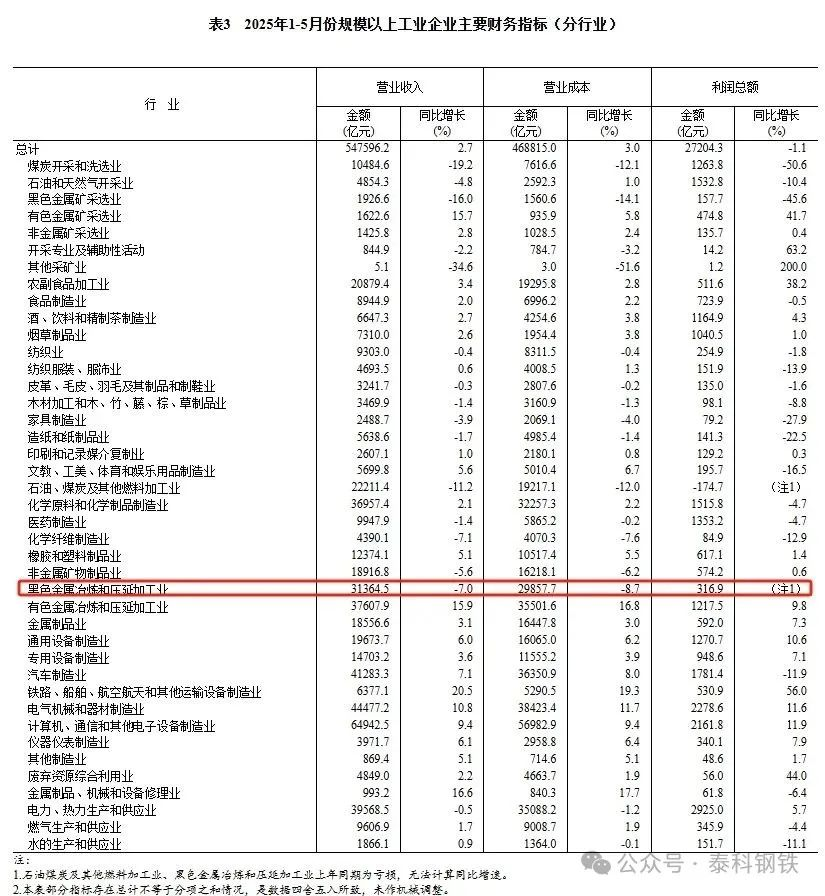 1—5月份,黑色金屬冶煉和壓延加工業(yè)利潤總額316.9億元。2024年同期1-5月,黑色金屬冶煉和壓延加工業(yè)實(shí)現(xiàn)營業(yè)收入32891.2億元,同比下降3.3%;營業(yè)成本31915.2億元,同比下降2.9%;虧損127.2億元。