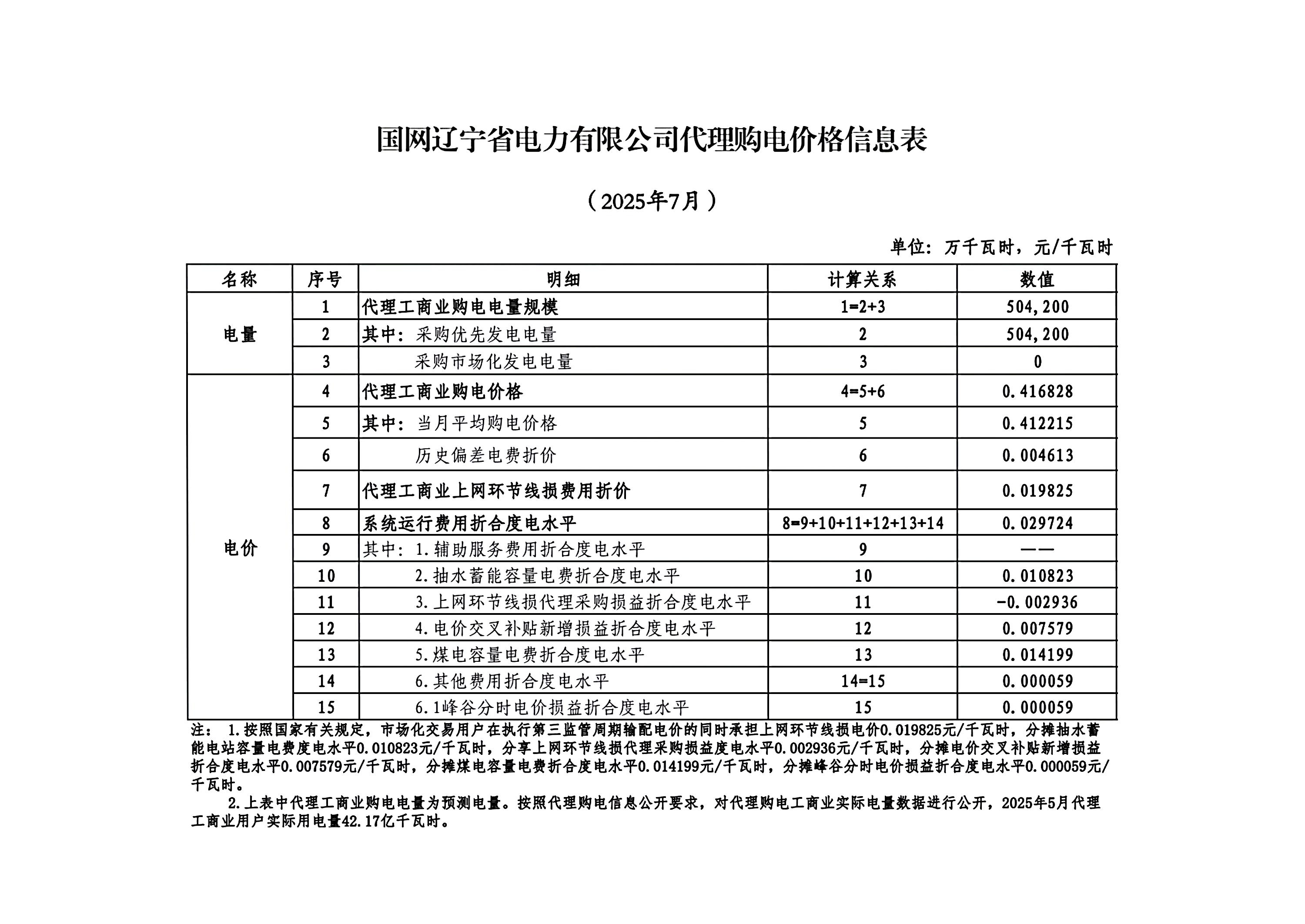 國網(wǎng)遼寧省電力有限公司代理購電工商業(yè)用戶電價(jià)表(2025年7月)