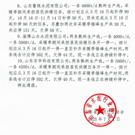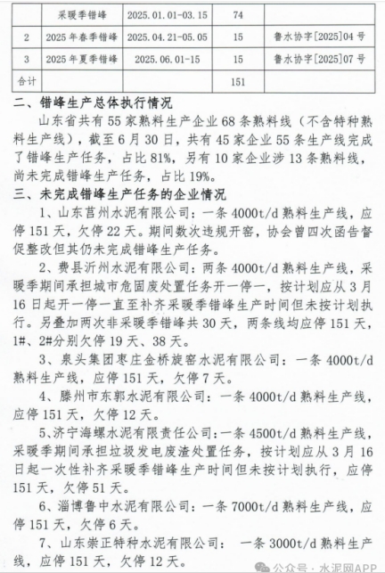 近日,山東省水泥行業(yè)協(xié)會(huì)發(fā)布“關(guān)于水泥熟料企業(yè)錯(cuò)峰生產(chǎn)執(zhí)行情況通報(bào)”稱(chēng),山東省共有55家熟料生產(chǎn)企業(yè)68條熟料線(不含特種熟料生產(chǎn)線),截至6月30日,共有45家企業(yè)55條生產(chǎn)線完成了錯(cuò)峰生產(chǎn)任務(wù),占比81%,另有10家企業(yè)涉13條熟料線,尚未完成錯(cuò)峰生產(chǎn)任務(wù),占比19%。全文如下: