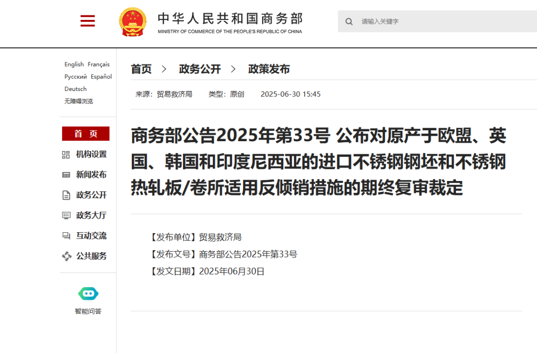 2024年7月22日,應中國不銹鋼鋼坯和不銹鋼熱軋板/卷產(chǎn)業(yè)申請,商務部發(fā)布2024年第30號公告,對原產(chǎn)于歐盟、英國、韓國和印度尼西亞的進口不銹鋼鋼坯和不銹鋼熱軋板/卷所適用的反傾銷措施進行期終復審調(diào)查。