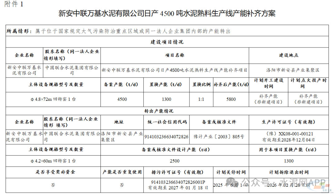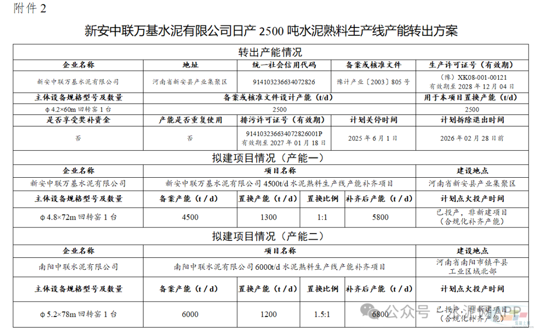 置換產(chǎn)能來自新安中聯(lián)萬基水泥有限公司2500t/d水泥熟料生產(chǎn)線(用于本項(xiàng)目置換產(chǎn)能1300t/d)。