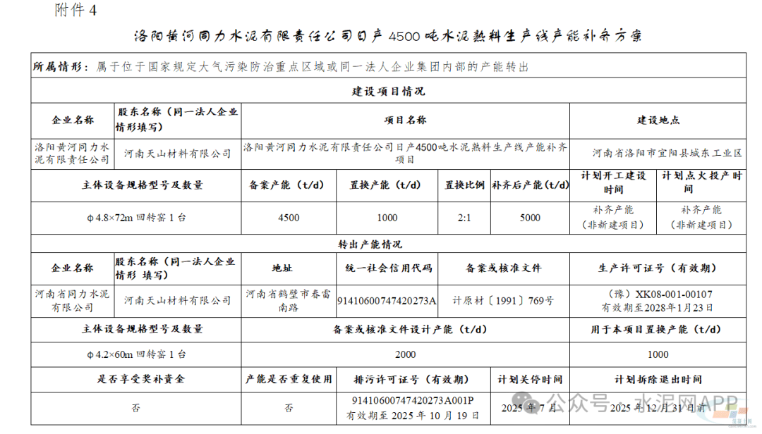 置換產(chǎn)能來自河南省同力水泥有限公司2000t/d熟料生產(chǎn)線(用于本項(xiàng)目置換產(chǎn)能1000t/d)。