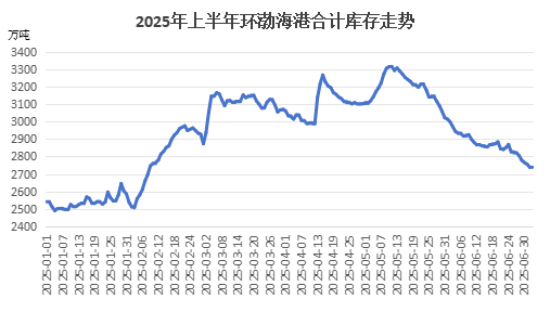 上半年由于煤炭供需關(guān)系持續(xù)寬松,煤價不斷下行,跌幅均值在20%以上。產(chǎn)量方面,2025年上半年國內(nèi)原煤產(chǎn)量整體保持同比增長趨勢,據(jù)國家統(tǒng)計局?jǐn)?shù)據(jù),1-5月全國原煤產(chǎn)量達到19.9億噸,同比增長6%;庫存方面,上半年北方港口煤炭庫存整體持續(xù)處于歷史偏高水平,持續(xù)累庫至5月月中創(chuàng)歷史最高水平后回落,截至6月30日環(huán)渤海港合計煤炭庫存在2765.4萬噸,較年初累計增加224.4萬噸,增幅在8.83%。