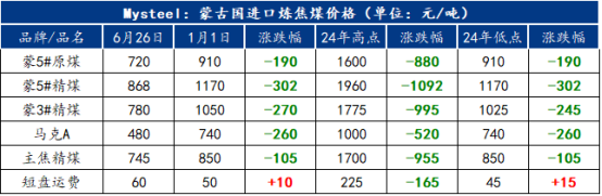 國內雙焦市場弱勢運行,進口蒙古國煉焦煤隨之下跌,口岸各煤種銷售價格從年初高位逐月下滑,現(xiàn)已接近貿(mào)易企業(yè)成本線,但短盤運費、監(jiān)管區(qū)倉儲等固定成本費用變化不大,口岸貿(mào)易企業(yè)利潤空間不斷受到擠壓。部分企業(yè)近期暫停拉運,轉向消化監(jiān)管區(qū)現(xiàn)有庫存,等待三季度市場行情。截止6月26日甘其毛都口岸蒙5#原煤口岸提貨含稅價720元/噸,環(huán)比年初下跌190元/噸;蒙5#精煤烏不浪口金泉工業(yè)園區(qū)含稅價868元/噸,環(huán)比年初下跌302元/噸;甘其毛都口岸蒙3#精煤口岸提貨含稅價780元/噸,環(huán)比年初下跌270元/噸;策克口岸馬克A原煤含稅價480元/噸,環(huán)比年初下跌260元/噸;滿都拉主焦精煤含稅價745元/噸,環(huán)比年初下跌105元/噸。但與之對應的甘其毛都口岸短盤運費60元/噸,環(huán)比年初上漲10元/噸。