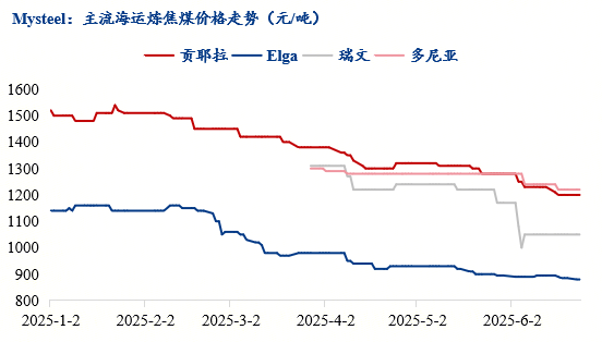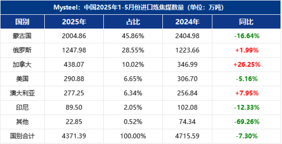 據(jù)海關總署最新數(shù)據(jù)顯示,截止5月底,2025年中國進口量煉焦煤總計4371.39萬噸,同比下降7.3%?。其中,蒙古國作為我國進口煤的主要來源國,減量尤為明顯,年同比下降16.64%(-400.12萬噸)。2025年初三大口岸過貨量目標增長至8100萬噸,較2024年過貨量目標增長15.71%,較2024年實際完成過貨量增長8.0%。過貨目標增加導致口岸監(jiān)管區(qū)周轉壓力明顯,庫存持續(xù)高位,1月底至4月底連續(xù)三個月庫存在400萬噸以上,最高值超460萬噸,超出核定庫容32%。監(jiān)管區(qū)周轉壓力導致通關過貨不增反降,6月底甘其毛都口岸監(jiān)管區(qū)庫存再度突破至410萬噸附近,貿(mào)易企業(yè)拉運積極性不足,下半年蒙煤供應難有大幅增長。根據(jù)Mysteel數(shù)據(jù),截止2025年5月底進口焦煤總量達到4371.39萬噸左右,其中海運煉焦煤進口2366.53萬噸,年同比微增2.42%左右,其中俄煤占據(jù)海運煉焦煤總量的52.73%。美國焦煤進口量第一季度并未顯示出頹勢,主要還是由于前期搶進口及國內進口關稅的靈活期導致到港量維持相對高位,但是到二季度進口量開始下行。而我國國內貿(mào)易環(huán)節(jié)認為美國焦煤進口在28%的進口關稅水平下仍然難改進口頹勢,在5月份進口量歸零。澳大利亞、加拿大的進口焦煤資源也因為中國一直為其機會市場,并沒有大范圍向我國發(fā)運,雖然加拿大、澳大利亞焦煤同比增加26.25%、7.95%,但是此兩者未能有效彌補美國焦煤進口暫歇形成的缺口。而從進口海運焦煤到港情況可以看出,俄羅斯主流礦山增加對我國國內長協(xié)供應,4-5月其已經(jīng)重新回到海運焦煤到港量的頭部位置,每周到港量達到40-50萬噸左右。加拿大及澳大利亞焦煤資源到港波動性更強,源于國內貿(mào)易及終端定期采買量有限、其礦山事故停產(chǎn)、且受到船運周期較長等因素影響到港。綜合全年來看,2025年中國進口煉焦煤總量或為1.05億噸,同比減少1600萬噸左右。