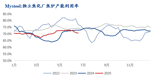 上半年煉焦煤需求維持相對高位,但顯性補庫需求較弱,下游煉焦煤持續(xù)去庫趨勢,始終保持低庫存采購策略。原料煤價格持續(xù)讓利下,焦企仍保持高位生產(chǎn)。2025上半年Mysteel全國獨立焦企開工率73.42%同比增3.9%,增幅較為明顯Mysteel鋼廠焦企開工86.9%同比下移0.21%,弱穩(wěn)運行。從獨立焦企看,上半年獨立焦企開工較為平穩(wěn)保持小幅上升趨勢,華北焦企用煤消耗高于去年同期水平,華東以及東北區(qū)域焦企開工率低于去年同期,疊加區(qū)域性用煤結構或有差異,華北焦企庫存普遍低于去年同期水平。鋼廠焦企原料煤庫存相對平穩(wěn),生產(chǎn)節(jié)奏較為穩(wěn)定。上半年用煤消耗不減,低庫存采購仍能平衡生產(chǎn)端,中間環(huán)節(jié)需求量流動下較差,上半年煉焦煤需求對價格難有明顯驅動。下半年煉焦煤市場核心矛盾是對需求考驗,從宏觀經(jīng)濟,基建房地產(chǎn)仍有調控優(yōu)化政策出臺預期,政策環(huán)境以及方向仍相對友好,其次關稅貿(mào)易變化仍有具有不確定性,對市場情緒端仍有擾動。從下游需求看,鋼材出口市場轉弱以及疊加行政減產(chǎn)仍是不確定對原料仍有一定壓制。從焦化廠用煤采購看,下游仍受季節(jié)性影響,或推動結構性補庫需求,當下下游庫存處于絕對低位,市場價格吻合預期下,不排除會有間接性補庫信號顯現(xiàn)。下半年從焦化廠產(chǎn)能釋放和投產(chǎn)看,下半年凈新增產(chǎn)能1459萬噸,主要分布山西、內蒙等區(qū)域,如按期投產(chǎn)對原料煤實際消耗有效果增加。從利潤看需求,總體看下半年煉焦煤市場邊際需求或有減弱,季度性備庫需求和新增產(chǎn)能主導是否能夠有效帶動需求轉化,需求的風險更多集中在下游焦企利潤進一步擠兌后的主動減產(chǎn)力度以及鋼材出口轉弱風險對原料煤形成負反饋。