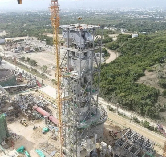 近日,由(天津水泥院)裝備集團總承包的多米尼加CIBAO水泥5線(日產3500噸熟料)項目窯尾塔架順利封頂。CIBAO水泥公司管理團隊、總包管理團隊及分包單位和全體施工人員共同見證這一重要時刻。