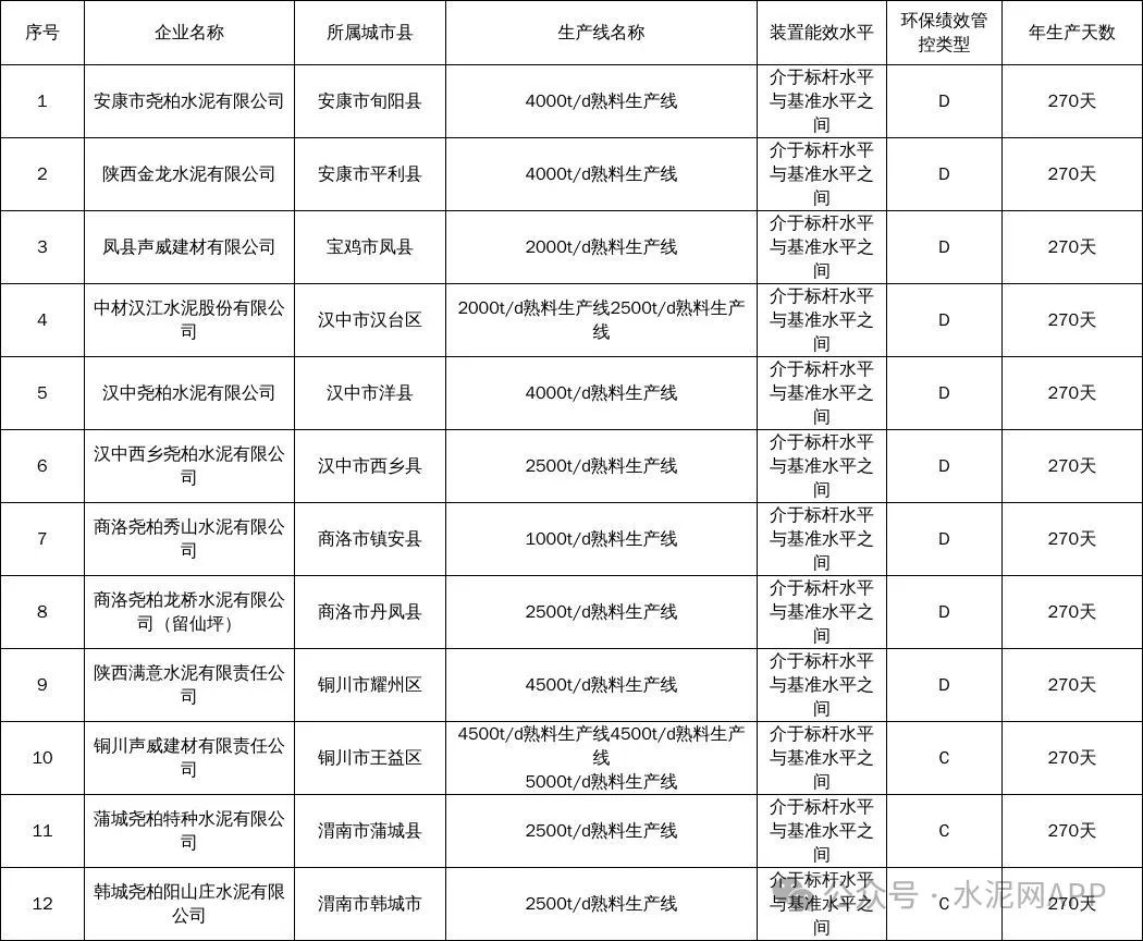 公告顯示,陜西省共12條水泥熟料生產(chǎn)線(xiàn)生產(chǎn)時(shí)間按270計(jì)算,具體見(jiàn)下表:
