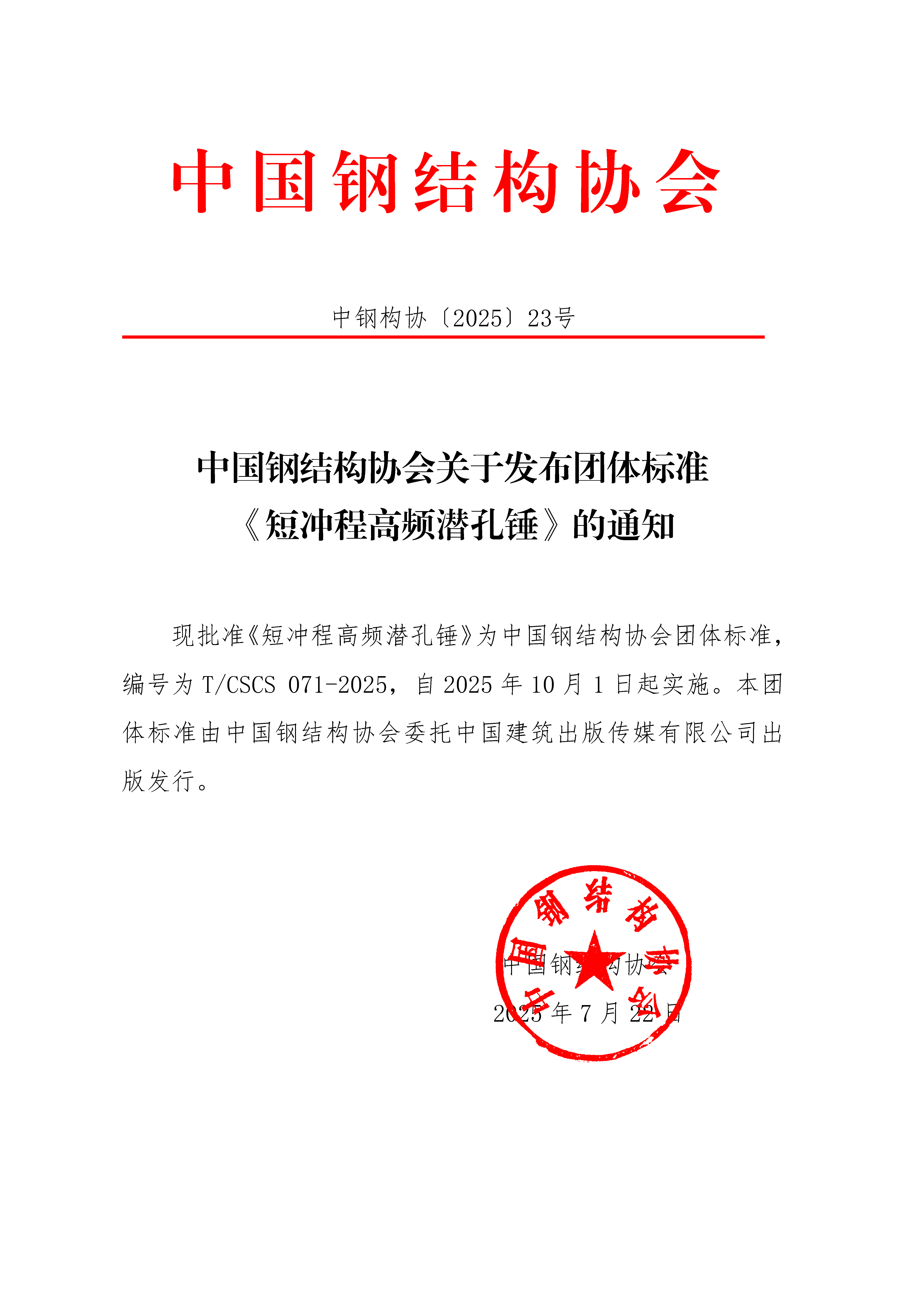 中國鋼結構協(xié)會關于發(fā)布團體標準《短沖程高頻潛孔錘》的通知