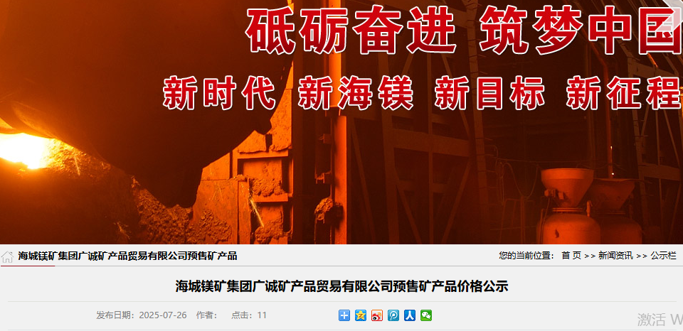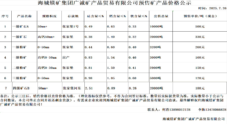 海城鎂礦集團廣誠礦產品貿易有限公司預售礦產品價格公示