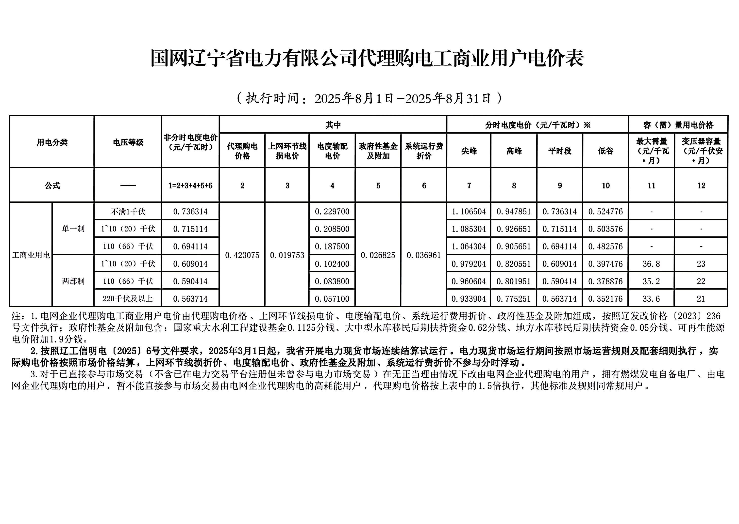 國網(wǎng)遼寧省電力有限公司代理購電工商業(yè)用戶電價表(2025年8月)
