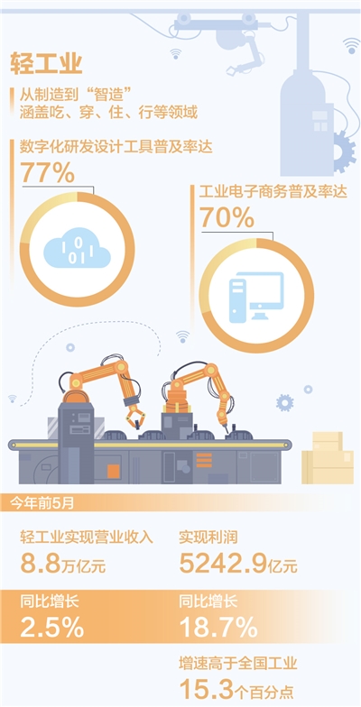 智能化走向深入。編制《輕工業(yè)數(shù)字化轉(zhuǎn)型發(fā)展報告》,發(fā)布70項數(shù)字化轉(zhuǎn)型創(chuàng)新成果,促進輕工業(yè)企業(yè)平臺化設計比例達16.3%,智能化生產(chǎn)比例達12.2%,分別高于制造業(yè)平均水平5.7個百分點和5.6個百分點。目前,輕工業(yè)數(shù)字化研發(fā)設計工具普及率為77%、工業(yè)電子商務普及率達70%,正加速向智造躍升。