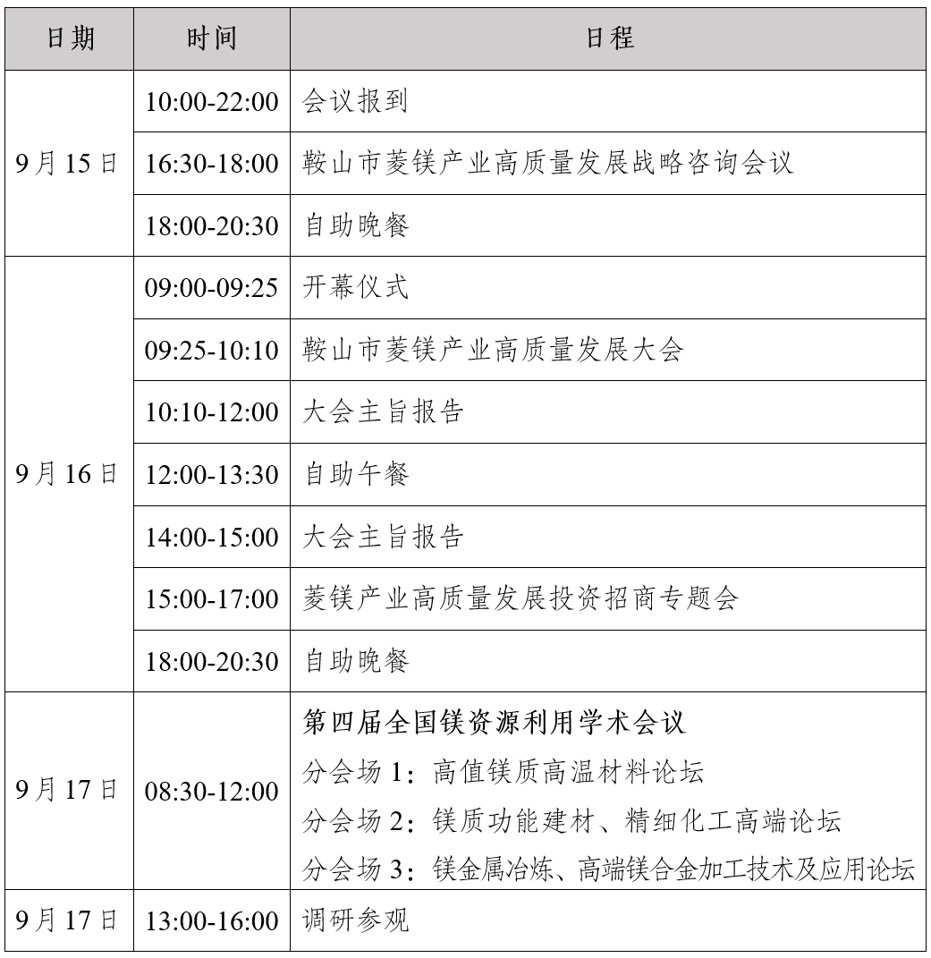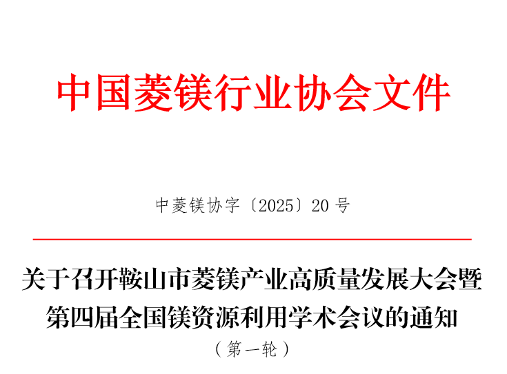 鞍山市菱鎂資源稟賦突出,保有儲(chǔ)量4.26億噸、占全國(guó)61.29%的菱鎂資源,素有“世界鎂都”的美譽(yù)。當(dāng)下,正值鞍山市菱鎂產(chǎn)業(yè)轉(zhuǎn)型升級(jí)、邁向高質(zhì)量發(fā)展的關(guān)鍵節(jié)點(diǎn),為提升鞍山市菱鎂產(chǎn)業(yè)科技創(chuàng)新能力,全力提升產(chǎn)業(yè)鏈高端化、綠色化、智能化發(fā)展,推進(jìn)產(chǎn)業(yè)鏈、創(chuàng)新鏈、人才鏈深度融合,健全鞍山市菱鎂產(chǎn)業(yè)技術(shù)、人才和產(chǎn)業(yè)體系,將于2025年9月15日-17日在遼寧省海城市舉辦“鞍山市菱鎂產(chǎn)業(yè)高質(zhì)量發(fā)展大會(huì)暨第四屆全國(guó)鎂資源利用學(xué)術(shù)會(huì)議”,旨在加強(qiáng)菱鎂產(chǎn)業(yè)科研成果交流及推廣應(yīng)用,推動(dòng)鞍山市菱鎂產(chǎn)業(yè)高質(zhì)量發(fā)展,助力鞍山市打造世界級(jí)菱鎂產(chǎn)業(yè)創(chuàng)新集群,擦亮“世界鎂都”城市名片。現(xiàn)將相關(guān)事宜通知如下。