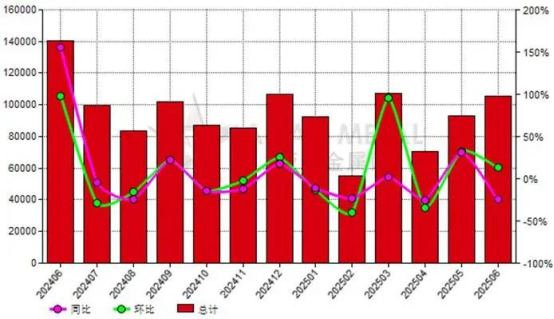 2025年6月份中國重燒鎂砂出口量105,279.61公噸,去年同期為140,319.89公噸,上月為93,275.97公噸,同比下滑24.97%,環(huán)比增長12.87%。