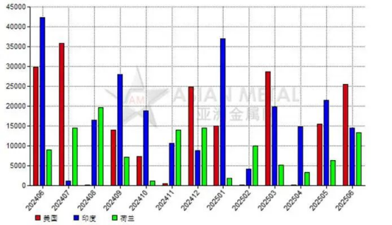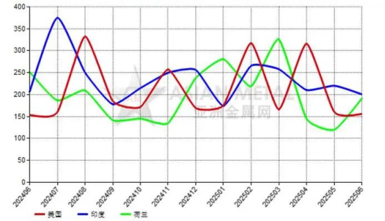 2025年6月,中國重燒鎂砂前三大出口目的國為美國、印度和荷蘭。