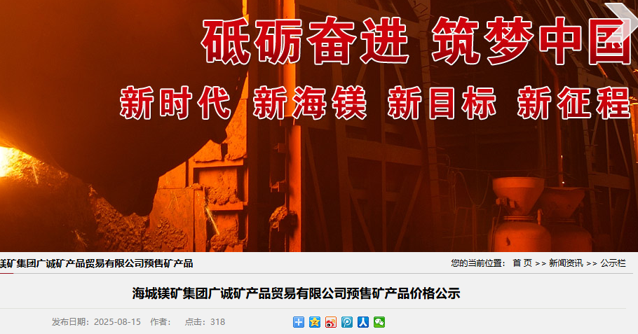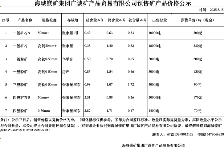 海城鎂礦集團(tuán)廣誠礦產(chǎn)品貿(mào)易有限公司預(yù)售礦產(chǎn)品價(jià)格公示