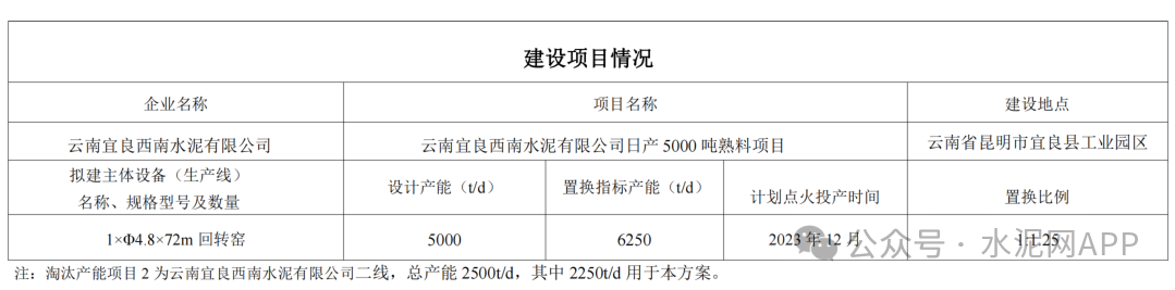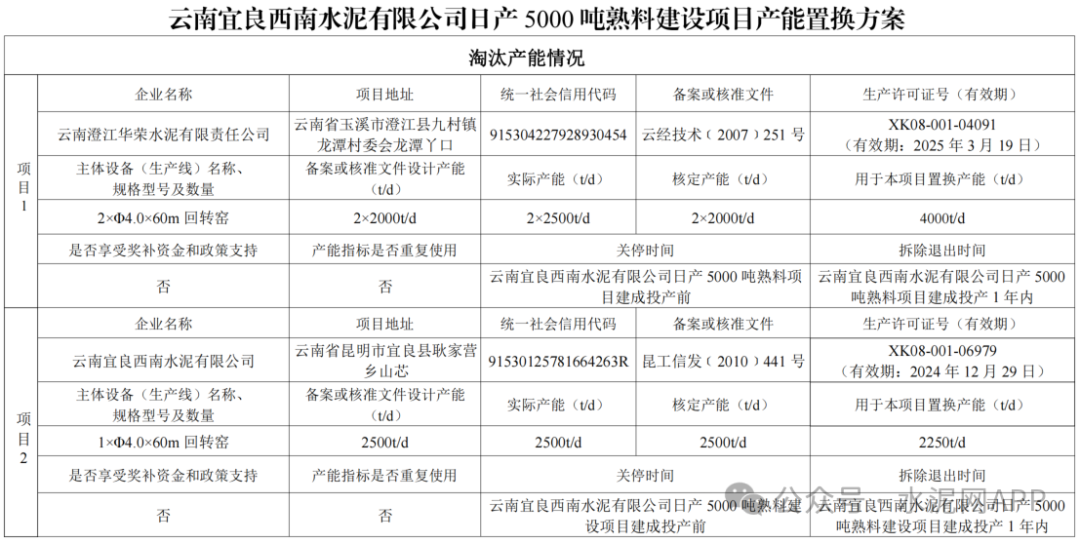 據(jù)此前發(fā)布的產(chǎn)能置換方案顯示,云南宜良西南水泥原計(jì)劃擬建一條5000t/d水泥熟料生產(chǎn)線,退出產(chǎn)能來自云南澄江華容水泥2*2000t/d,云南宜良西南水泥一條2500t/d(用于此項(xiàng)目2250t/d)。