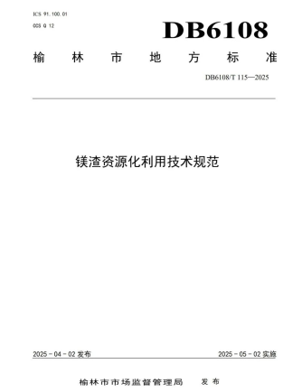 榆林市地方標準《鎂渣資源化利用技術規(guī)范》(DB6108/T 115—2025)已經(jīng)由榆林市市場監(jiān)督管理局于2025年4月發(fā)布,5月2日起實施。