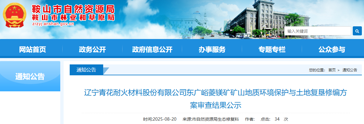 根據(jù)《國土資源部辦公廳關(guān)于做好礦山地質(zhì)環(huán)境保護(hù)與土地復(fù)墾方案編報(bào)有關(guān)工作的通知》(國土資規(guī)〔2016〕21號)、《遼寧省自然資源廳關(guān)于印發(fā)<礦山地質(zhì)環(huán)境保護(hù)與土地復(fù)墾方案省級審查管理辦法(試行)>的通知》(遼自然資發(fā)〔2022〕129號)有關(guān)要求,我局組織專家對《遼寧青花耐火材料股份有限公司東廣峪菱鎂礦礦山地質(zhì)環(huán)境保護(hù)與土地復(fù)墾修編方案》進(jìn)行了審查?,F(xiàn)將擬通過的方案及專家評審意見進(jìn)行公示,公示期自發(fā)布之日起7個(gè)工作日。