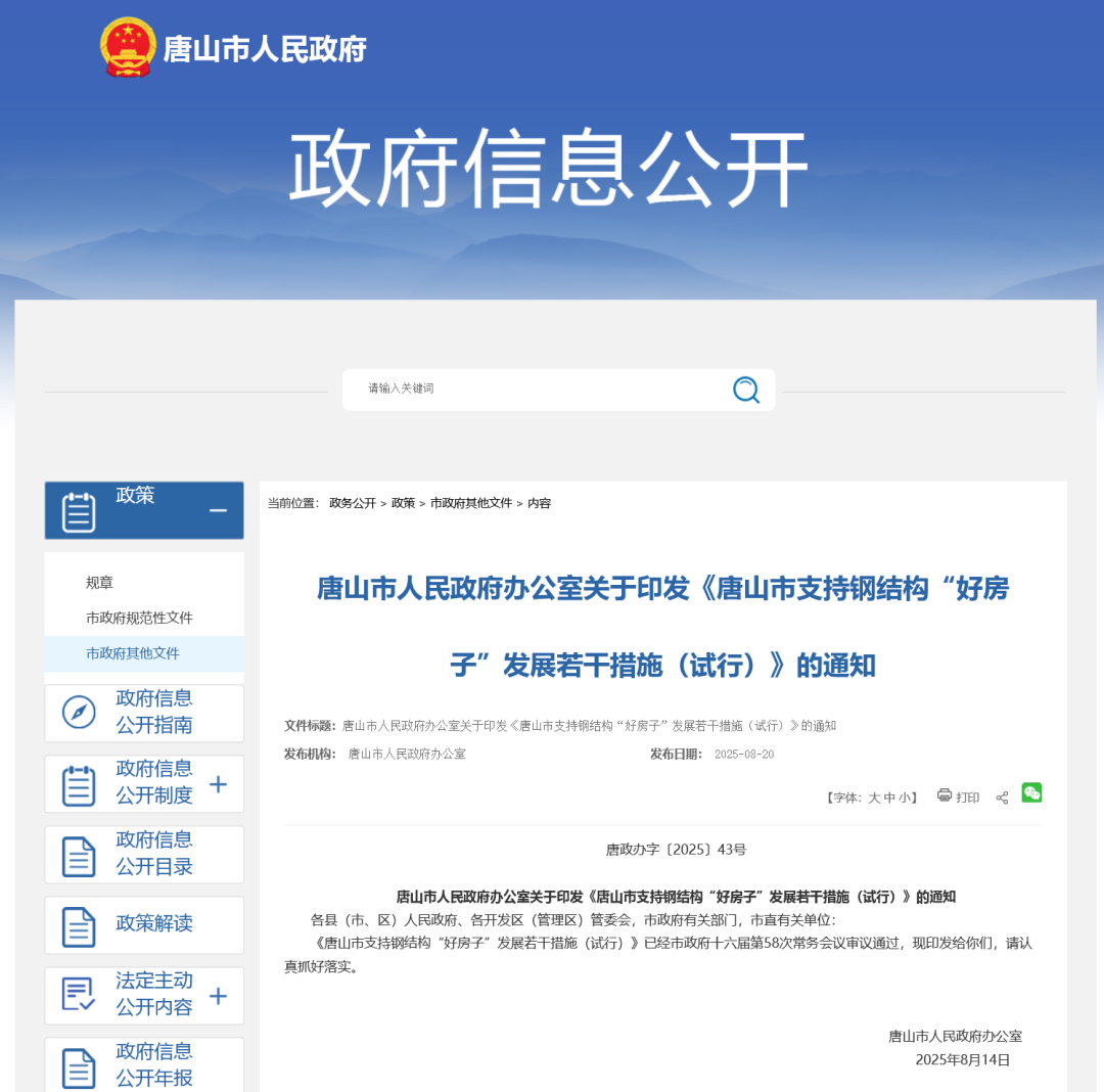 2025年8月20日,唐山市人民政府發(fā)布《唐山市支持鋼結(jié)構(gòu)“好房子”發(fā)展若干措施(試行)》通知。