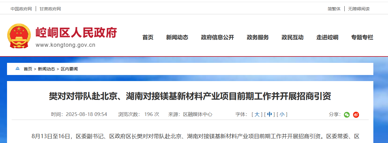 近日,崆峒區(qū)區(qū)委副書記、區(qū)政府區(qū)長樊對(duì)對(duì)帶隊(duì)赴北京、湖南對(duì)接鎂基新材料產(chǎn)業(yè)項(xiàng)目前期工作并開展招商引資。崆峒區(qū)區(qū)委常委、區(qū)政府常務(wù)副區(qū)長郭凱參加。