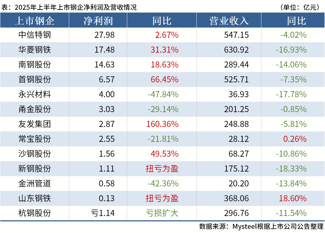 據(jù)統(tǒng)計,截至8月25日,共有13家上市鋼企公布2025年上半年業(yè)績情況,合計營業(yè)收入3436.81億元,合計凈利潤81.35億元。